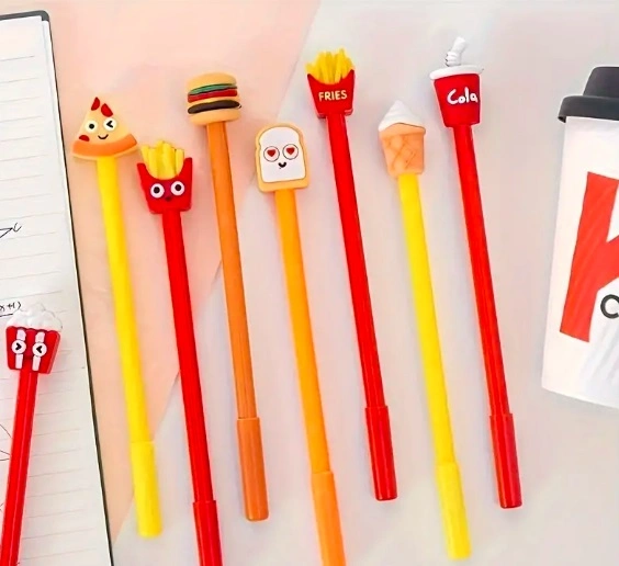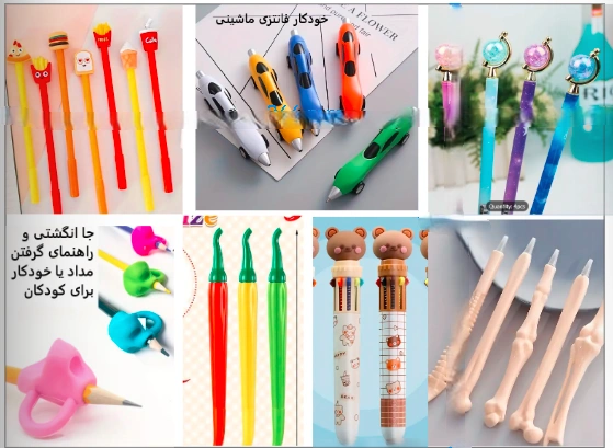 1 عدد روان نویس طرح ماشینی + 1 عدد فلفلی + 1 عدد استخوانی + 1 عدد ده رنگ عروسکی + 1 عدد کهکشانی + 1 عدد مک دونالدی + 1 عدد قلم گیر کودک